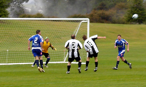 was deflected off Duncan Lowry's shin and on to his cross bar.