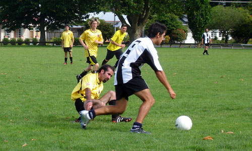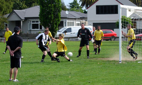 Adam Graham smacks home the first of his two goals for the Matamata XI.